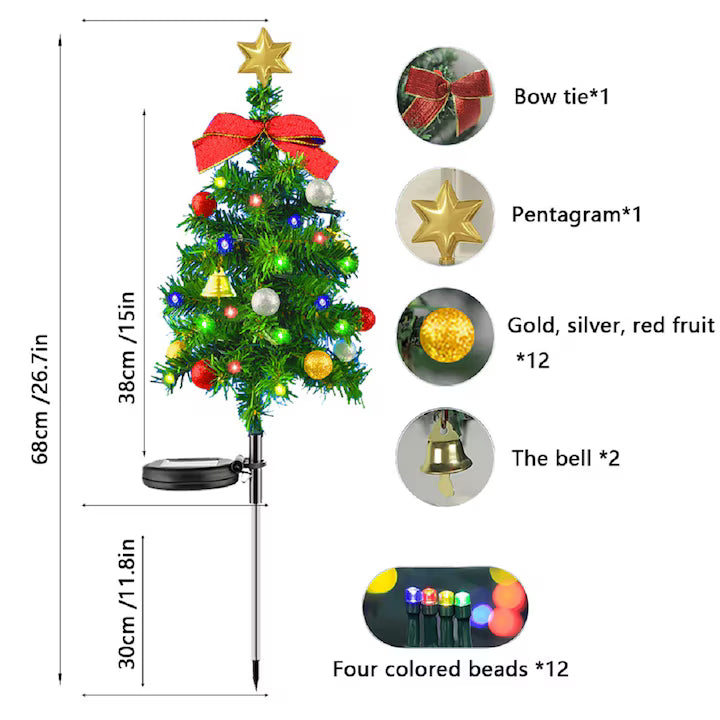 Lampa solară pentru grădină cu LED, în formă de brad, adaugă un efect decorativ plăcut și elegant oricărui spațiu exterior. Cu o înălțime de 68 cm și lumină multicoloră, această lampă este ideală pentru curți, alei, terase sau grădini. Este prevăzută cu țăruș pentru fixare ușoară în sol și este complet waterproof, rezistentă la ploaie și condiții meteo variate. Funcționează cu energie solară, oferind lumină ecologică și economie de energie.