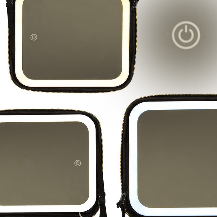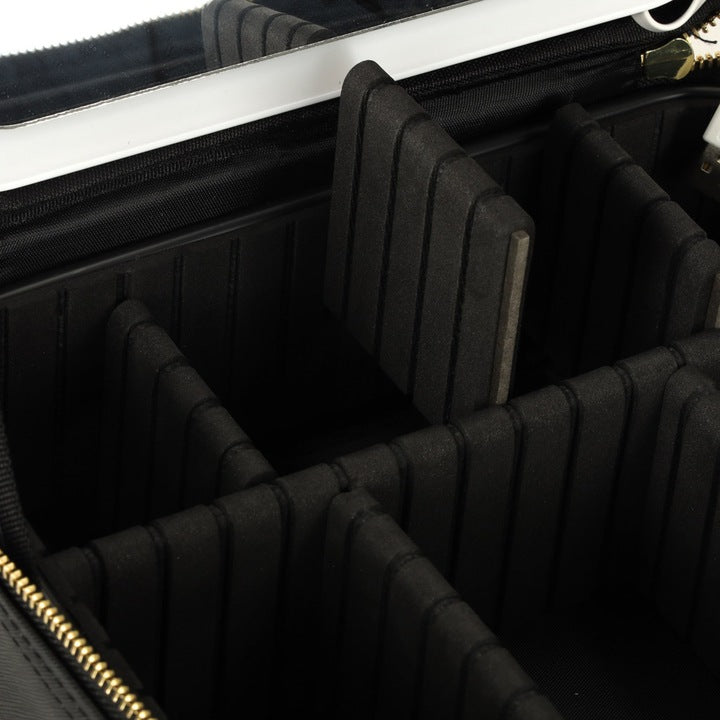 O geanta neagra pentru cosmetice de calatorie va fi solutia perfecta pentru urmatoarele calatorii! Este perfecta nu numai pentru depozitarea produselor cosmetice , ci si te ajuta sa aplici un machiaj precis in toate conditiile – are o oglinda cu iluminare LED din spate . In interior, geanta cosmetica are multe compartimente pe care le poti transforma liber pentru a se potrivi nevoilor tale . Setul include si un buzunar pentru perii sau alte obiecte mici.