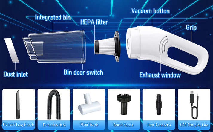 Aspiratie puternica - Aspiratorul nostru portabil are o putere mare de aspiratie de 6000 pa si o putere nominala de intrare de 120 W, care poate curata rapid si complet praful, parul de animale si resturile. Acest aspirator de mana foloseste o cale mare de aspiratie liniara: motorul , cupa de praf si ciclonul sunt amplasate intr-o linie dreapta, astfel incat eficienta fluxului de aer si puterea de aspiratie sunt imbunatatite efectiv, usurand munca de curatare.