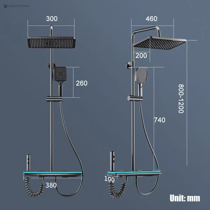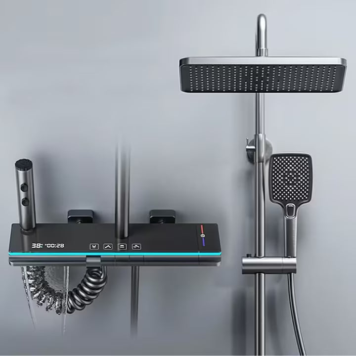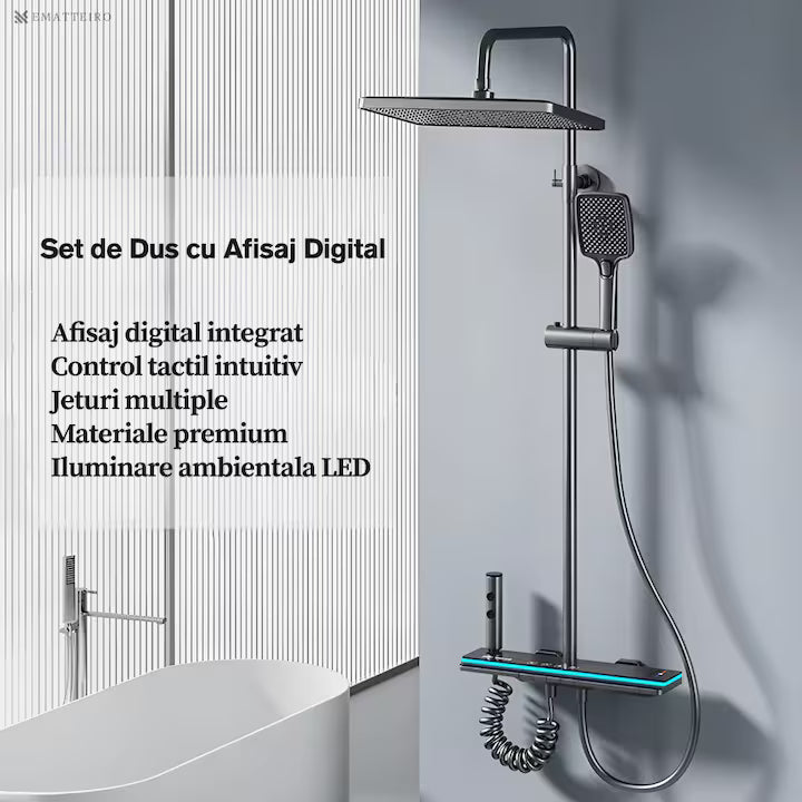 Sistemul de duș prezentat în imagine este un model modern, cu un design minimalist, care combină funcționalitatea cu tehnologia digitală. Printre caracteristicile sale principale se numără: