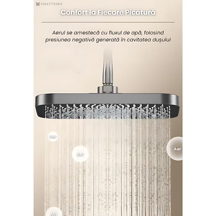 Cap de duș superior: Este prevăzut cu un cap de duș mare, cu efect de ploaie, care oferă o experiență de duș imersivă și relaxantă.