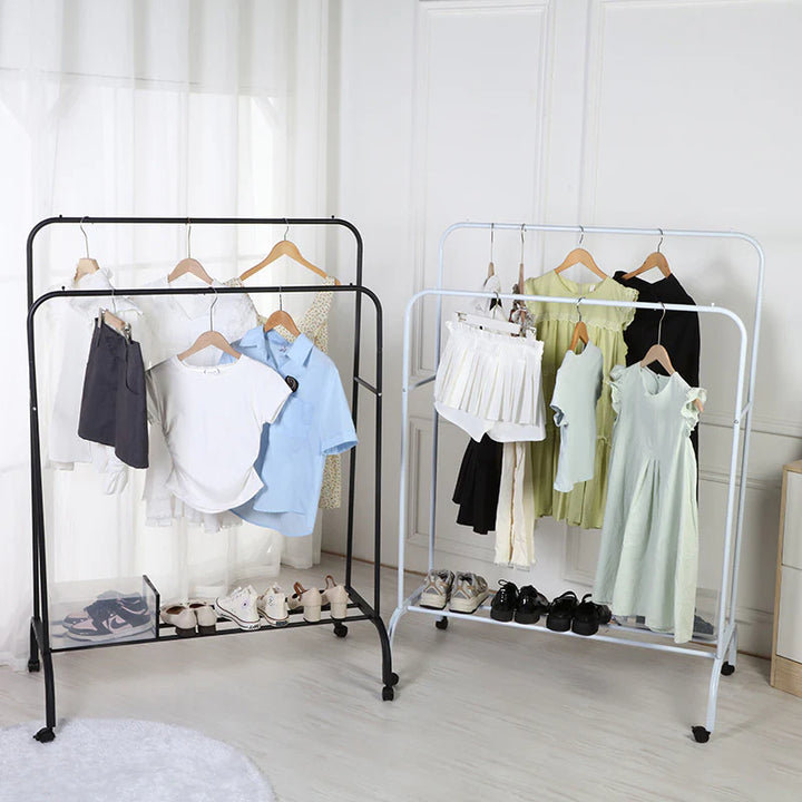 Suport de Haine Metalic cu 2 Bare pentru Umerașe, 8 Cârlige Laterale și Suport pentru Pantofi – Design Modern, Stabil și Ușor de Asamblat