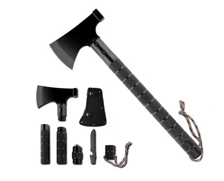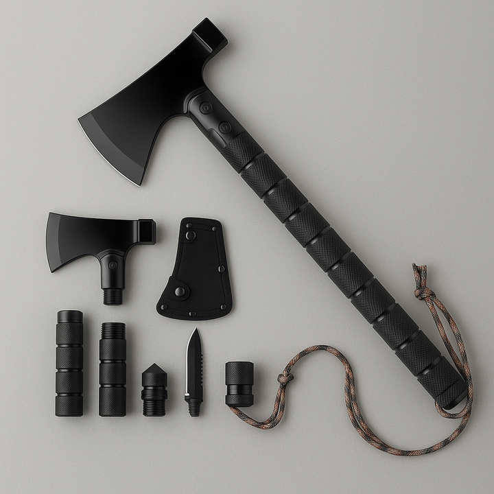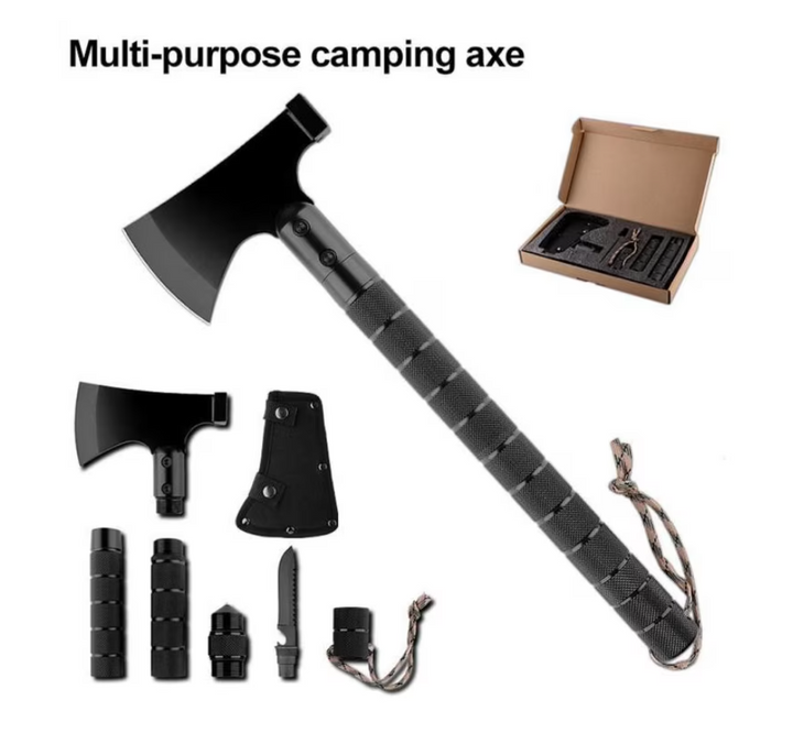 Lamele ascuțite și accesoriile integrate transformă acest topor într-o unealtă versatilă, potrivită pentru tăiere, ciocănire, prindere sau deschidere.